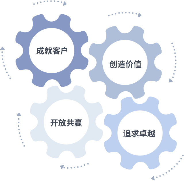 成就客户是一切决策的出发点,,,创造价值是衡量所有工作的标准,,,,追求卓越是我们做事做人的态度,,,,开放共赢是我们的格局也是最终的结果。。价值观的齿轮环环相扣,,,,推动着组织里的每个人不断向前。。。